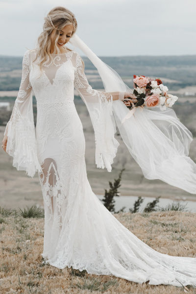 Adelia Lune is the bohemian wedding gown you will never want to take off. Effortlessly cool, this long sleeve style is simple, sexy and timeless. Hand knotted fringe accentuates the beautiful bell sleeves and an unmistakable lace design is fitted through the body and flares out into a full skirt and train. This gown has a Midnight (with front slit) slip underlay and a mesh fabric overlay with embroidered applique lace detailing, as well as a flattering low back design.
